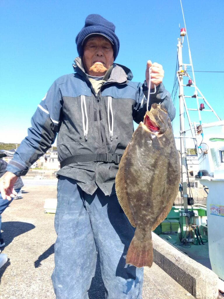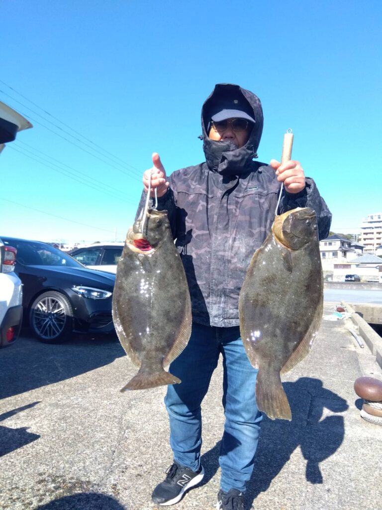 1月 6日(火) 釣果情報 2026.01.06 釣り物 ヒラメ 釣果 0.4~3.0kg 3~9尾 釣り場所 外川沖 水深 10m 天候、晴れ、北西の風、5~8m、水温、14.0℃、水色、やや良、潮流、だし真潮。 外道、カサゴ、スズキ。 アタリあり順調…………!!!!。 鈴木様 今井様