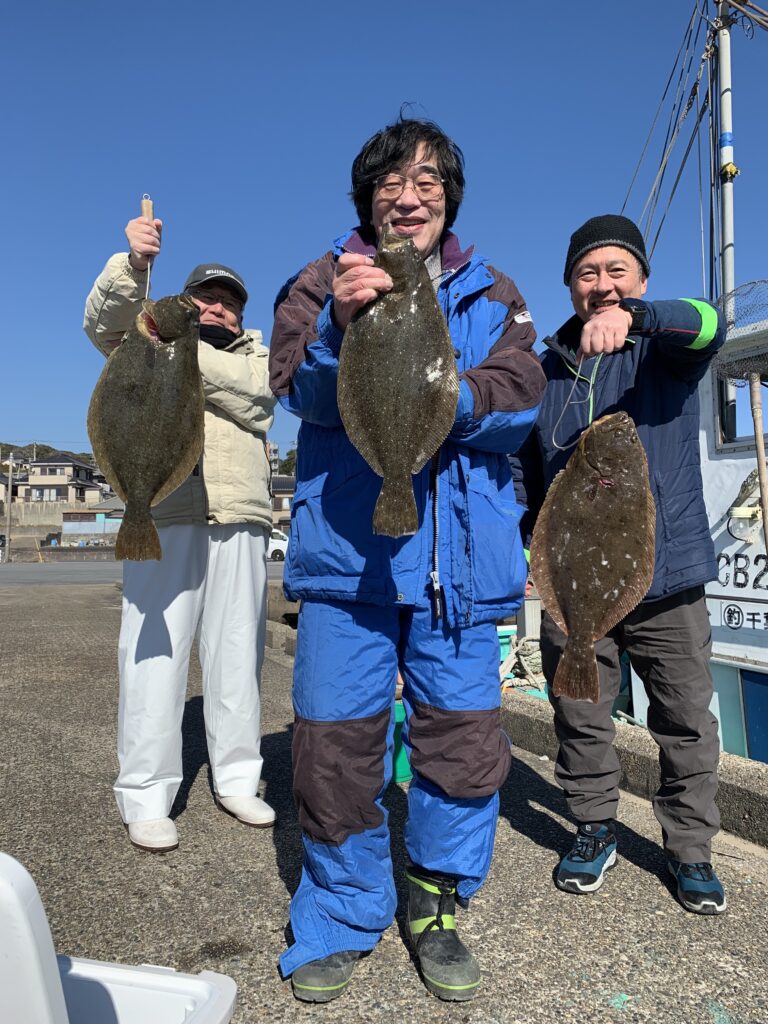 2月 1日(日) 釣果情報 2026.02.01 釣り物 ヒラメ 釣果 0.4~4.7kg 0~8尾 釣り場所 外川沖 水深 15m 天候、晴れ、北西の風、4~5m、水温、14.7℃、水色、やや良、潮流、込み潮。 外道、スズキ。 良型混じりで型あり順調……………………!!!!!!。 土井様 山下様 荒金様